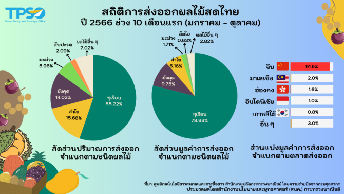 ในช่วง 5 ปีที่ผ่านมา มูลค่าการส่งออกผลไม้สดของไทยเติบโตอย่างต่อเนื่อง (การส่งออกหดตัวในปี 2565 แต่ช่วง 10 เดือนแรกของปี 2566 มูลค่าการส่งออกกลับมาขยายตัว) โดยช่วงปี 2561 - 2565 มีอัตราการเติบโตต่อปี (CAGR) อยู่ที่ร้อยละ 22.8 มีมูลค่าการส่งออกอยู่ที่ 1,944.5, 2,908.4, 3,311.9, 5,061.1 และ 4,416.0 ล้านเหรียญสหรัฐ ตามลำดับ และมีอัตราการเติบโต อยู่ที่ร้อยละ 16.0, 49.6, 13.9, 52.8 และ -12.8 ตามลำดับ นอกจากนี้ พบว่าไทยพึ่งพาการส่งออกผลไม้สดไปตลาดจีนเพิ่มขึ้น โดยเฉพาะการส่งออกทุเรียน มังคุด ลำไย และส้มโอ โดยในปี 2561 มูลค่าการส่งออกผลไม้สดจากไทยไปจีน คิดเป็นสัดส่วนร้อยละ 37.2 ของมูลค่าการส่งออกผลไม้สดทั้งหมดของไทย และมีสัดส่วนเพิ่มขึ้นเป็นร้อยละ 88.3 ในปี 2565 ขณะที่ช่วง 10 เดือนแรกของปีนี้ (มกราคม - ตุลาคม) มีสัดส่วนสูงถึงร้อยละ 91.6