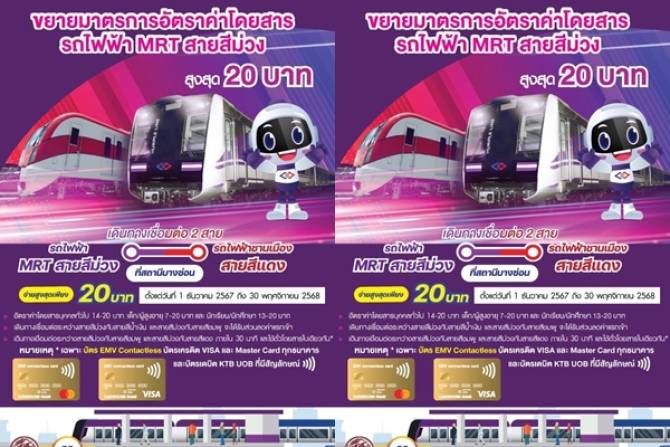 ขณะเดียวกัน นายวิทยา พันธุ์มงคล รองผู้ว่าการ (ปฏิบัติการ) รักษาการแทนผู้ว่าการ รฟม. กล่าวว่า การขยาย ระยะเวลามาตรการอัตราค่าโดยสารรถไฟฟ้าสูงสุด 20 บาทตลอดสาย ในระบบรถไฟฟ้า MRT สายสีม่วง จะดําเนินการ ต่อทันที โดยมีอัตราค่าโดยสารสําหรับบุคคลทั่วไป 14-20 บาท เด็ก/ผู้สูงอายุ 7-20 บาท และนักเรียน นักศึกษา 13-20 บาท นอกจากนี้ กรณีที่ผู้โดยสารรถไฟฟ้า MRT สายสีม่วง ของ รฟม. เดินทางเชื่อมต่อกับรถไฟชานเมือง สายสีแดงของ รฟท. ที่สถานีบางซ่อน โดยใช้บัตร EMV Contactless ใบเดียวกันในการชําระค่าโดยสาร และเปลี่ยนถ่าย ระบบภายในระยะเวลา 30 นาที จะชําระค่าโดยสารทั้งสองสายรวมกัน สูงสุด 20 บาท