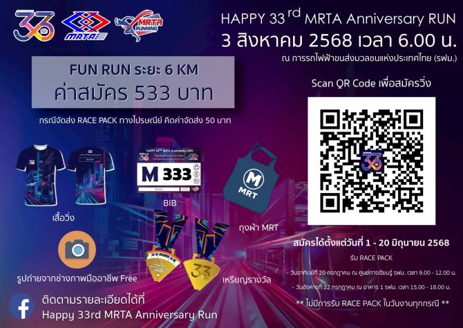 การรถไฟฟ้าขนส่งมวลชนแห่งประเทศไทย (รฟม.) จัดกิจกรรมเดิน - วิ่ง เพื่อสุขภาพ “Happy 33rd MRTA Anniversary Run” เนื่องในโอกาสพิเศษครบรอบ 33 ปี วันคล้ายวันก่อตั้ง รฟม. จัดขึ้นภายใต้แนวคิดวิ่ง 33 ปี รฟม. 3+3 ระยะทางรวม 6 กิโลเมตร ผู้ร่วมกิจกรรมจะได้วิ่งผ่าน 3 Landmark ดังนี้ ศูนย์ซ่อมบำรุงรถไฟฟ้ามหานคร สายเฉลิมรัชมงคล (MRT สายสีน้ำเงิน) ศูนย์การเรียนรู้ด้านรถไฟฟ้าขนส่งมวลชน และศูนย์ฝึกอบรมการรักษาความปลอดภัยและดับเพลิง - กู้ภัยระบบขนส่งทางราง โดยกิจกรรมดังกล่าวจะจัดขึ้นในวันอาทิตย์ที่ 3 สิงหาคม 2568 ณ อาคาร 1 รฟม.