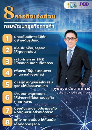 อธิบดีพูนพงษ์ฯ กล่าวต่อว่า “ตนได้วางภารกิจเร่งด่วน 8 ด้าน เพื่อยกระดับงานให้บริการและพัฒนาผู้ประกอบการอย่างรอบด้าน ประกอบไปด้วย 1) การยกระดับบริการดิจิทัลอย่างเต็มรูปแบบ โดยขณะนี้กรมฯ มีความพร้อมให้บริการจดทะเบียนและบริการข้อมูลธุรกิจในรูปแบบออนไลน์ 100% แต่เราจะยังไม่หยุดพัฒนารูปแบบการใช้งานและปรับปรุงฟังก์ชันต่างๆ ให้ใช้งานได้ง่ายยิ่งขึ้น 2) การเชื่อมโยงข้อมูลธุรกิจให้ทุกภาคส่วนเข้าถึงและใช้ประโยชน์ได้อย่างสะดวก ปลอดภัย และเป็นปัจจุบัน เป็นการทำงานหลังบ้านที่จะเชื่อมต่อข้อมูลนิติบุคคลเข้ากับระบบของหน่วยงานทั้งภาครัฐและเอกชน ซึ่งจะช่วยลดภาระค่าใช้จ่ายของภาคธุรกิจทั้งการเดินทาง ลดการใช้กระดาษ และเพิ่มความเร็วในการดำเนินธุรกิจที่สำคัญเราจะผลักดันให้มีการนำข้อมูลธุรกิจไปวิเคราะห์ต่อยอด เพื่อสร้างมูลค่าเพิ่มทางเศรษฐกิจ วิเคราะห์เชิงนโยบาย และป้องกันความเสี่ยงทางธุรกิจ โดยภาครัฐสามารถกำหนดแนวทางการพัฒนาได้อย่างเหมาะสมและตรงจุด 3) การส่งเสริมศักยภาพ SME ให้ตรงตามความต้องการ โดยเฉพาะธุรกิจกลุ่มค้าส่ง-ค้าปลีก ร้านอาหาร สุขภาพและความงาม ธุรกิจครอบครัว และบริการผู้สูงอายุ ซึ่งเป็นกลุ่มที่สอดรับกับนโยบายเร่งด่วนของรัฐมนตรีว่าการกระทรวงพาณิชย์ (นางศุภจี สุธรรมพันธุ์) โดยจะเร่งพัฒนาศักยภาพผู้ประกอบการให้ทันต่อสภาพตลาดในยุคปัจจุบันและบูรณาการกับหน่วยงานที่เกี่ยวข้องเข้าไปส่งเสริม การพัฒนาระบบหลังบ้าน โดยการนำเทคโนโลยีเข้ามาช่วยในการบริหารจัดการธุรกิจ 4) การเพิ่มรายได้ผู้ประกอบการผ่านการค้าออนไลน์ โดยเพิ่มช่องทางและโอกาสทางการค้าผ่านอีคอมเมิร์ซทั้งไทยและต่างชาติ สร้างโอกาสให้ผู้ค้ารายเล็กได้มีช่องทางการตลาดที่หลากหลายมากขึ้น สามารถสร้างคอนเทนต์ด้วยตัวเองได้อย่างน่าสนใจ ขายสินค้า/บริการผ่านโลกออนไลน์ให้เป็น รวมถึงเราจะขยายความร่วมมือไปยังแพลตฟอร์มขายสินค้าออนไลน์ต่างๆ เพื่อร่วมกันสนับสนุนผู้ประกอบการไทยด้วย