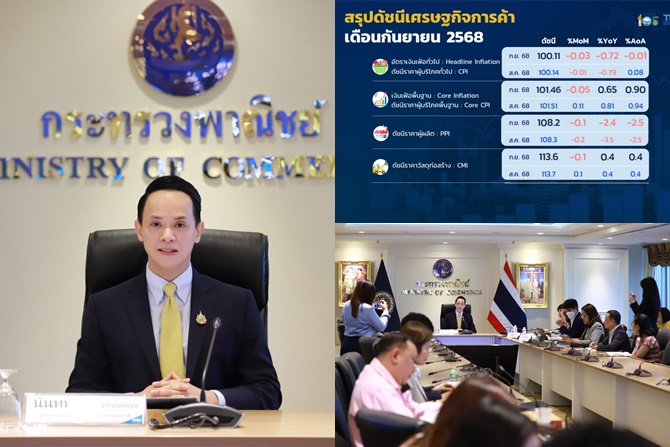 เมื่อวันที่ 6 ตุลาคม 2568 นายนันทพงษ์ จิระเลิศพงษ์ ผู้อำนวยการสำนักงานนโยบายและยุทธศาสตร์การค้า เผยว่า ดัชนีราคาผู้บริโภคทั่วไปของไทย เดือนกันยายน 2568 เท่ากับ 100.11 เมื่อเทียบกับเดือนกันยายน 2567 ซึ่งเท่ากับ 100.84 ทำให้อัตราเงินเฟ้อทั่วไปลดลงร้อยละ 0.72 (YoY) โดยปัจจัยหลักมาจากราคาสินค้ากลุ่มพลังงานลดลง ทั้งค่ากระแสไฟฟ้าและน้ำมันเชื้อเพลิงตามนโยบายของภาครัฐ และราคาพลังงานในตลาดโลกที่ปรับตัวลดลง ประกอบกับราคาสินค้าสำคัญในกลุ่มอาหารสดยังคงลดลงเมื่อเทียบกับปีที่ผ่านมา โดยเฉพาะไข่ไก่ ผักสด และผลไม้สด สำหรับราคาสินค้าและบริการอื่น ๆ ส่งผลกระทบต่อภาวะเงินเฟ้อไม่มากนัก