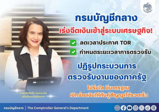 กรมบัญชีกลางเร่งฉีดเงินเข้าสู่ระบบเศรษฐกิจ หน่วยงานสามารถลดเวลาประกาศ TOR กำหนดระยะเวลาการตรวจรับที่ชัดเจน หนุนฉีดเงิน 4 ล้านล้านบาทเข้าสู่ระบบเศรษฐกิจในปี 2569