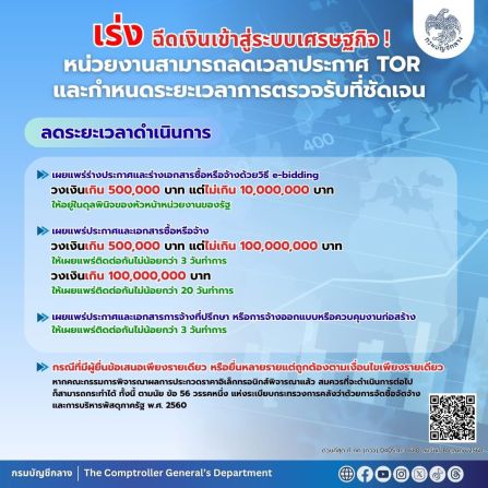 กรมบัญชีกลางเร่งฉีดเงินเข้าสู่ระบบเศรษฐกิจ หน่วยงานสามารถลดเวลาประกาศ TOR กำหนดระยะเวลาการตรวจรับที่ชัดเจน