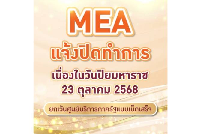 โดยที่ทำการ MEA อื่น ๆ จะเปิดทำการและให้บริการตามปกติ ในวันศุกร์ที่ 24 ตุลาคม 2568 ระหว่างเวลา 07.30 – 15.30 น.