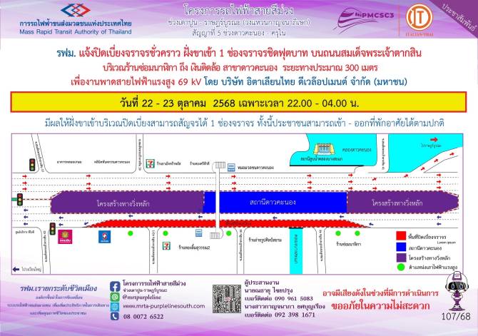 การรถไฟฟ้าขนส่งมวลชนแห่งประเทศไทย (รฟม.) แจ้งว่า บริษัท อิตาเลียนไทย ดีเวล๊อปเมนต์ จำกัด (มหาชน) ผู้รับจ้างงานก่อสร้างทางวิ่งและสถานียกระดับ อาคารจอดรถไฟฟ้าและอาคารจอดแล้วจร โครงการรถไฟฟ้าสายสีม่วง ช่วงเตาปูน - ราษฎร์บูรณะ (วงแหวนกาญจนาภิเษก) สัญญาที่ 5 ช่วงดาวคะนอง - ครุใน มีความจำเป็นต้องปิดเบี่ยงจราจรชั่วคราว ฝั่งขาเข้า 1 ช่องจราจร ชิดฟุตบาท บนถนนสมเด็จพระเจ้าตากสิน บริเวณร้านซ่อมนาฬิกา ถึง เงินติดล้อ สาขาดาวคะนอง ระยะทางประมาณ 300 เมตร เพื่องานพาดสายไฟฟ้าแรงสูง 69 kV ในวันที่ 22 - 23 ตุลาคม 2568 เฉพาะเวลา 22.00 - 04.00 น. โดยมีผลให้ฝั่งขาเข้าสามารถสัญจรได้ 1 ช่องจราจร ทั้งนี้ ประชาชนสามารถเข้า-ออก ที่พักอาศัยได้ตามปกติ