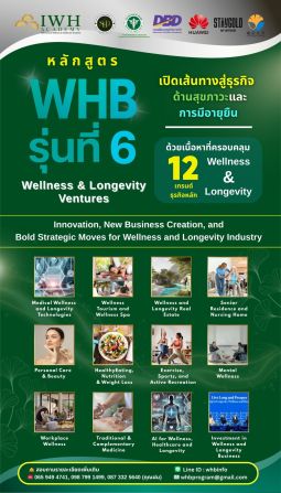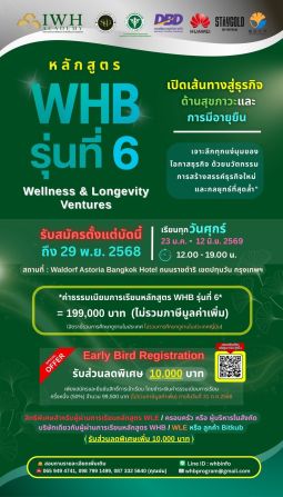 กรมพัฒนาธุรกิจการค้า กระทรวงพาณิชย์ เดินหน้าขับเคลื่อนประเทศไทยสู่การเป็นศูนย์กลางธุรกิจสุขภาพและการแพทย์ของโลก (Global Wellness & Healthcare Hub) จับมือพันธมิตรภาครัฐและเอกชนชั้นนำ สานต่อความสำเร็จหลักสูตร ‘Wellness and Healthcare Business Opportunity Program for Executives : WHB’ รุ่นที่ 6 Wellness & Longevity Ventures มุ่งยกระดับผู้นำธุรกิจสุขภาพของไทยให้มีวิสัยทัศน์ระดับโลก พร้อมรับกระแส Wellness Economy ที่เติบโตอย่างก้าวกระโดดทั่วโลก...ชวนผู้บริหารหน่วยงานและกลุ่มธุรกิจ Wellness สมัครเข้าร่วมอบรมตั้งแต่บัดนี้ - วันที่ 29 พฤศจิกายน 2568 ทาง https://whb.info/whb/application/แล้วคุณจะได้เปิดโลกทัศน์มุมใหม่อีกมุมที่คุณไม่เคยรู้!