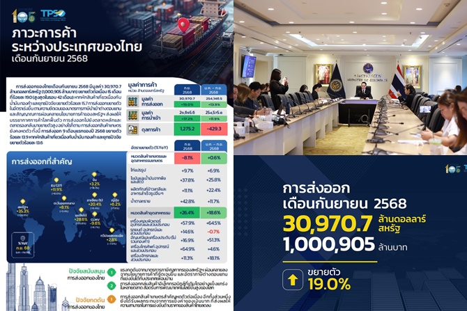เมื่อวันที่ 27 ตุลาคม 2568 นายนันทพงษ์ จิระเลิศพงษ์ ผู้อำนวยการสำนักงานนโยบายและยุทธศาสตร์การค้า (สนค.) แถลงการส่งออกของไทยในเดือนกันยายน 2568 มีมูลค่า 30,970.7 ล้านดอลลาร์สหรัฐ (1,000,905 ล้านบาท) ขยายตัวต่อเนื่องเป็นเดือนที่ 15 ที่ร้อยละ 19.0 ซึ่งเป็นอัตราการขยายตัวสูงสุดในรอบ 42 เดือน นับตั้งแต่เดือนเมษายน 2565 หากหักสินค้าเกี่ยวเนื่องกับน้ำมัน ทองคำ และยุทธปัจจัย ขยายตัวที่ร้อยละ 15.7 การส่งออกขยายตัวในอัตราเร่งขึ้นตามความชัดเจนของมาตรการภาษีนำเข้าต่างตอบแทนของสหรัฐฯ ประกอบกับสัญญาณการผ่อนคลายนโยบายการค้าของสหรัฐฯ ที่เพิ่มมากขึ้น ส่งผลให้บรรยากาศการค้าโลกฟื้นตัว การส่งออกไปยังตลาดหลักและตลาดรองกลับมาขยายตัวสูง อย่างไรก็ตาม การส่งออกสินค้าเกษตรของไทยยังคงอยู่ในภาวะหดตัว ทั้งนี้ การส่งออก 9 เดือนแรกของปี 2568 ขยายตัวที่ร้อยละ 13.9 หากหักสินค้าเกี่ยวเนื่องกับน้ำมัน ทองคำ และยุทธปัจจัย ขยายตัวที่ร้อยละ 13.6
