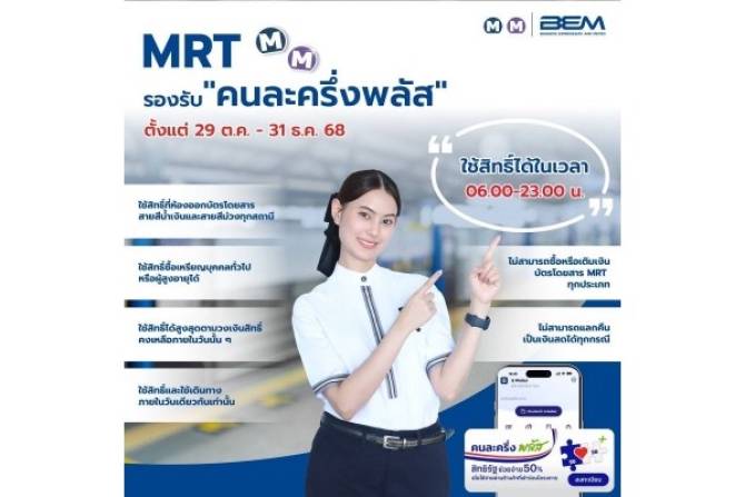 โดยผู้ได้รับสิทธิ์ในโครงการ “คนละครึ่ง พลัส” สามารถใช้สิทธิ์ชำระค่าโดยสารรถไฟฟ้าผ่านแอปพลิเคชัน “เป๋าตัง” (G-Wallet) ได้ตั้งแต่วันที่ 29 ตุลาคม ถึง 31 ธันวาคม 2568 ที่ห้องจำหน่ายบัตรโดยสารทุกสถานี ของรถไฟฟ้า MRT ทั้ง 4 สาย ระหว่างเวลา 06.00 – 23.00 น.