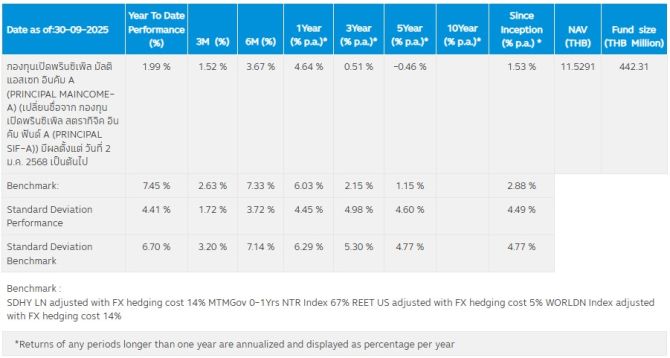 กองทุน PRINCIPAL MAINCOME เป็นกองทุนที่ลงทุนหลักในตราสารหนี้ กองทุนอสังหาริมทรัพย์ และกองทุนโครงสร้างพื้นฐานที่มีโอกาสสร้างรายได้สม่ำเสมอ เหมาะสำหรับนักลงทุนที่มองหา “รายได้ประจำ" และต้องการพอร์ตที่มีความผันผวนค่อนข้างต่ำ เป็นกองทุนที่มีผลตอบแทนคาดหวังเฉลี่ยต่อปีอยู่ที่ 4%