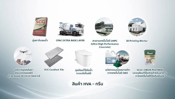 ปูนคาร์บอนต่ำ ปูนคาร์บอนต่ำ อยู่ระหว่างพัฒนาปูนคาร์บอนต่ำ รุ่นใหม่ Generation 3 ที่ลดคาร์บอนไดออกไซด์ได้ถึง 38% โดยเตรียมปรับกำลังการผลิต 2 ล้านตัน/ปี ภายในปี 2570 ที่จ.สระบุรี และ CPAC Extra Base Layer นวัตกรรมซ่อม-สร้างถนนลดการยุ บตัวและคงตัวทนนานจากการกั ดเซาะน้ำ สะพาน UHPC (Ultra High Performance Concrete) สมรรถนะสูง ลดเวลาก่อสร้างได้ถึง 50% 3D Printing Mortar เทคโนโลยีการขึ้นรูปอาคารก่อสร้ างที่มีดีไซน์ซับซ้อน ขยายตลาดไปญี่ปุ่น ซาอุดิอาระเบีย และมาเลเซีย ยกระดับ Roof Installation บริการมุงหลังคาครบวงจรเอสซีจี ด้วย Drone AI ตรวจรอยรั่วหลังคาและวิเคราะห์ โครงสร้างแบบ 3 มิติ ช่วยให้ซ่อมแซมรวดเร็ว ปลอดภัย และแม่นยำยิ่งขึ้น SCG Comfort Tile กระเบื้องซีเมนต์ปูพื้ นรายแรกในไทย ที่ลดความร้อนสะสมได้ 3–7°C ด้วย HeatSync Technology ให้พื้นเย็น เดินสบาย สุขภัณฑ์ไร้ถังประหยัดน้ำ DUACT และแบบ “เคลือบจากเปลือกไข่–หอย” ลดการปล่อยก๊าซเรือนกระจก นวัตกรรมเม็ดพลาสติ กจากเทคโนโลยี SMX ช่วยลดความหนาของผลิตภัณฑ์ ลงโดยยังคงความแข็งแรง พัฒนาเป็นสินค้าหลากหลาย เช่น ท่ออุตสาหกรรมเหมืองแร่ขนาดใหญ่ ฝาขวดน้ำอัดลม ถังบรรจุสารเคมี และบรรจุภัณฑ์สินค้าอุปโภคบริ โภค นวัตกรรมพลาสติกรีไซเคิล ทั้งเทคโนโลยีรีไซเคิลเชิงกล และเทคโนโลยีรีไซเคิลขั้นสูง ซึ่งใช้ผลิตเป็นบรรจุภัณฑ์