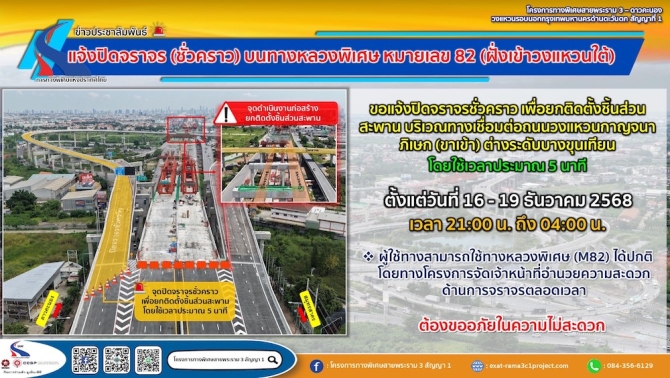 การทางพิเศษแห่งประเทศไทย (กทพ.) ได้ว่าจ้าง กิจการร่วมค้า ยูเอ็น - ซีซี ประกอบด้วย บริษัท ยูนิค เอ็นจิเนียริ่ง แอนด์ คอนสตรัคชั่น จำกัด (มหาชน) และบริษัท ซีวิล คอนสตรัคชั่น เซอร์วิสเชส แอนด์โปรดักส์ จำกัด เป็นผู้รับจ้างดำเนินการก่อสร้าง โครงการทางพิเศษสายพระราม 3 – ดาวคะนอง –วงแหวนรอบนอกกรุงเทพมหานคร ด้านตะวันตก สัญญาที่ 1 จะดำเนินการก่อสร้างทางยกระดับ โดยจะปิดจราจร (ชั่วคราว) บนทางหลวงพิเศษ หมายเลข 82 เพื่อยกติดตั้งชิ้นส่วนสะพาน บริเวณทางเชื่อมต่อถนนวงแหวนกาญจนาภิเษก (ขาเข้า) ต่างระดับบางขุนเทียน ตั้งแต่วันที่ 16-19 ธันวาคม 2568 เวลา 21:00 น. ถึง 04:00 น. โดยใช้เวลาครั้งละประมาณ 5 นาที ผู้ใช้ทางสามารถใช้ทางหลวงพิเศษ (M82) ได้ตามปกติ โดยทางโครงการจัดเจ้าหน้าที่อำนวยความสะดวกด้านการจราจรตลอดเวลา ทั้งนี้ กทพ. ได้ทำการติดตั้งป้ายแจ้งการจราจรก่อนถึงพื้นที่ก่อสร้างและติดตั้งไฟสัญญาณไฟจราจรต่าง ๆ ป้ายประชาสัมพันธ์การเบี่ยงจราจรพร้อมไฟวับวาบ เพื่อให้ผู้ใช้เส้นทางได้ทราบ