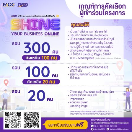 “เครื่องมือดิจิทัลถือเป็นกุญแจสำคัญในการปลดล็อกข้อจำกัด และสร้างโอกาสใหม่ให้ผู้ประกอบธุรกิจไทย โอกาสนี้จึงขอเชิญชวนเจ้าของธุรกิจ ผู้ที่กำลังเริ่มต้นธุรกิจออนไลน์ รวมถึงผู้ประกอบธุรกิจที่สนใจต่อยอดทำการตลาดโดยใช้เครื่องมือดิจิทัลขั้นสูง สมัครเข้าร่วมกิจกรรม SHINE YOUR BUSINESS ONLINE ได้ฟรี สมัครได้ตั้งแต่วันนี้จนถึงวันที่ 31 มกราคม 2569 หรือจนกว่าที่นั่งจะเต็ม ที่เว็บไซต์ www.dbd.go.th เลือกหัวข้อ ข่าวประชาสัมพันธ์ หรือสอบถามรายละเอียดเพิ่มเติมที่ กองพาณิชย์อิเล็กทรอนิกส์ กรมพัฒนาธุรกิจการค้า หมายเลขโทรศัพท์ 0 2547 5959 หรือ Call center 1570” อธิบดีพูนพงษ์ฯ กล่าวทิ้งท้าย