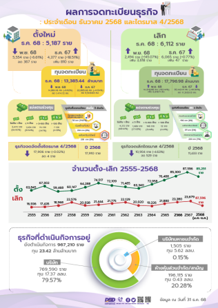 เมื่อวันที่ 20 มกราคม 2569 นายพูนพงษ์ นัยนาภากรณ์ อธิบดีกรมพัฒนาธุรกิจการค้า กระทรวงพาณิชย์ เปิดเผย ผลการวิเคราะห์สถานการณ์การจดทะเบียนจัดตั้งธุรกิจใหม่เดือนธันวาคม 2568 พบว่า มีธุรกิจจัดตั้งใหม่ 5,187 ราย เมื่อเทียบกับเดือนที่ผ่านมา (MoM) เดือนพฤศจิกายน 2568 (5,554 ราย) ลดลง 367 ราย คิดเป็น 6.61% และเมื่อเทียบกับช่วงเวลาเดียวกันของปีที่ผ่านมา (YoY) เดือนธันวาคม 2567 (4,377 ราย) เพิ่มขึ้น 810 ราย คิดเป็น 18.51%