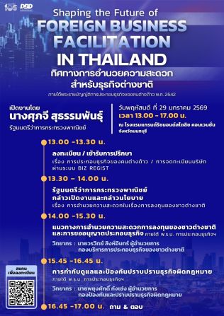 การสัมมนา ‘Shaping the Future of Foreign Business Facilitation in Thailand : ทิศทางการอำนวยความสะดวกสำหรับธุรกิจต่างชาติ ภายใต้พระราชบัญญัติการประกอบธุรกิจของคนต่างด้าว พ.ศ. 2542’ ที่จะจัดขึ้นในวันพฤหัสบดีที่ 29 มกราคม 2569 ณ ห้อง Richmond Ballroom 2-3 ชั้น 6 โรงแรมแกรนด์ ริชมอนด์ สไตลิช คอนเวนชั่น จ.นนทบุรี พร้อมเปิดกว้างให้นักธุรกิจทั้งชาวไทยและต่างชาติเข้าร่วมสัมมนาฯ โดยผู้สนใจสามารถสมัครเข้าร่วมงานฯ ได้ทางเว็บไซต์ https://forms.gle/mJmEpCux3iLhSQYU9 ฟรี!! ไม่มีค่าใช้จ่าย โดยเปิดรับสมัครตั้งแต่วันนี้เป็นต้นไป และขอสงวนสิทธิ์ปิดรับสมัครเมื่อจำนวนที่นั่งครบตามจำนวน” อธิบดีพูนพงษ์ กล่าวทิ้งท้าย