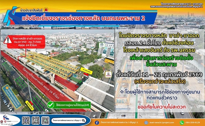 การทางพิเศษแห่งประเทศไทย (กทพ.) ได้ว่าจ้าง กิจการร่วมค้า ยูเอ็น - ซีซี ประกอบด้วย บริษัท ยูนิค เอ็นจิเนียริ่ง แอนด์ คอนสตรัคชั่น จำกัด (มหาชน) และบริษัท ซีวิล คอนสตรัคชั่น เซอร์วิสเชส แอนด์โปรดักส์ จำกัด เป็นผู้รับจ้างดำเนินการก่อสร้าง โครงการทางพิเศษสายพระราม 3 - ดาวคะนอง - วงแหวนรอบนอกกรุงเทพมหานครด้านตะวันตก สัญญาที่ 1 โดยผู้รับจ้างจะดำเนินการก่อสร้างติดตั้งชิ้นส่วนสะพานของโครงการทางพิเศษดังกล่าว จึงมีความจำเป็นจะต้องปิดเบี่ยงจราจรช่องทางหลัก (ขาเข้า-ขาออก) บนถนนพระราม 2 ตั้งแต่ช่วงก่อนโรงเหล้าแสงจันทร์ ถึง รพ.นครธน (กม.6+350 - กม.7+500) ตั้งแต่วันที่ 11 - 22 กุมภาพันธ์ 2569 ตลอด 24 ชั่วโมง (หรือจนกว่าจะแล้วเสร็จ) โดยผู้ใช้ทางสามารถใช้ช่องทางคู่ขนานทดแทนชั่วคราว และเพื่อความปลอดภัยผู้รับจ้างได้จัดเจ้าหน้าที่อำนวยความสะดวกด้านการจราจรตลอดเวลา และได้ทำการติดตั้งป้ายแจ้งเตือนก่อนถึงพื้นที่ก่อสร้างและติดตั้งไฟสัญญาณไฟจราจรต่าง ๆ ป้ายประชาสัมพันธ์ การเบี่ยงจราจรพร้อมไฟวับวาบ เพื่อให้ผู้ใช้เส้นทางได้ทราบ