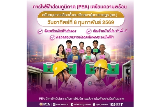 การไฟฟ้าส่วนภูมิภาค (PEA) ยืนยันความพร้อมดูแลความมั่นคงของระบบไฟฟ้าในสถานที่จัดการเลือกตั้งและการออกเสียงประชามติทั่วประเทศ ครอบคลุมศูนย์รวมคะแนนประจำอำเภอ ศูนย์รวมคะแนนประจำเขตเลือกตั้ง และศูนย์อำนวยการการเลือกตั้งประจำจังหวัด รวม 1,174 แห่ง