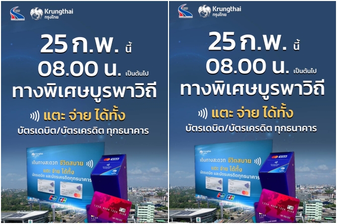 การทางพิเศษแห่งประเทศไทย (กทพ.) ขอแจ้งให้ผู้ใช้ทางพิเศษทราบว่า ตั้งแต่วันที่ 25 กุมภาพันธ์ 2569 เวลา 08.00 น. เป็นต้นไป ผู้ใช้บริการทางพิเศษบูรพาวิถีสามารถชำระค่าผ่านทางด้วยบัตรเดบิตและบัตรเครดิตแบบไร้สัมผัส (EMV Contactless) ได้แล้ว ครอบคลุม 18 ด่าน รวม 50 ช่องทาง โดยรองรับบัตรจากทุกธนาคาร ทั้ง Visa, Mastercard, JCB และ UnionPay