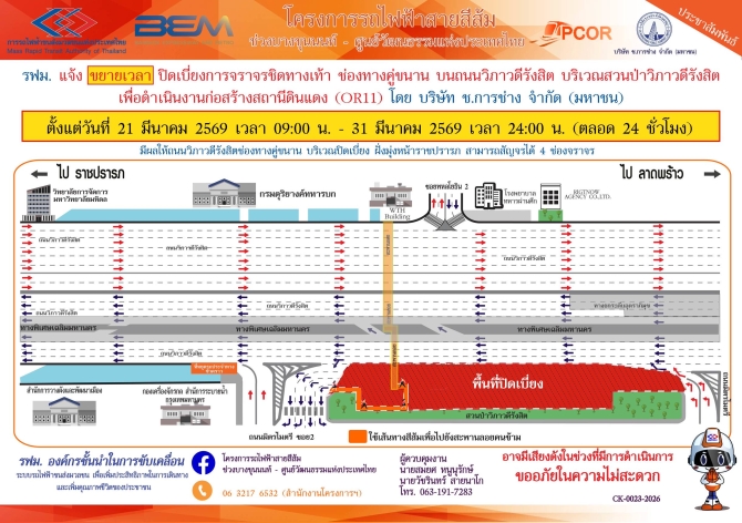 การรถไฟฟ้าขนส่งมวลชนแห่งประเทศไทย (รฟม.) แจ้งว่า บริษัท ช.การช่าง จำกัด (มหาชน) ผู้รับจ้างออกแบบและก่อสร้างอุโมงค์ทางวิ่งและสถานีใต้ดิน โครงการรถไฟฟ้าสายสีส้ม ช่วงบางขุนนนท์ – ศูนย์วัฒนธรรมแห่งประเทศไทย มีความจำเป็นต้องขยายเวลาปิดเบี่ยงการจราจรชิดทางเท้า 2 ช่องจราจร ช่องทางคู่ขนาน บนถนนวิภาวดีรังสิต บริเวณสวนป่าวิภาวดีรังสิต เพื่อดำเนินงานก่อสร้างสถานีดินแดง (OR11) ในวันที่ 21 มีนาคม 2569 เวลา 09:00 น. – 31 มีนาคม 2569 เวลา 24:00 น. (ตลอด 24 ชั่วโมง) มีผลให้ถนนวิภาวดีรังสิตช่องคู่ขนาน บริเวณปิดเบี่ยง ฝั่งมุ่งหน้าราชปรารภ สามารถสัญจรได้ 4 ช่องจราจรโดยประชาชนสามารถเข้า – ออกที่พักอาศัยได้ตามปกติ