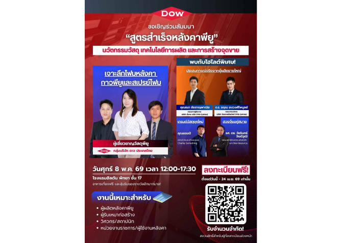 กลุ่มบริษัท ดาว ประเทศไทย (Dow) ผู้นำด้านวัสดุศาสตร์ระดับโลก จะจัดงานสัมมนา “สูตรสำเร็จหลังคาพียู: นวัตกรรมวัสดุ เทคโนโลยีการผลิต และการสร้างจุดขาย” เพื่อถ่ายทอดความรู้และประสบการณ์จริงให้แก่ ผู้ผลิตและผู้ติดตั้งหลังคาเมทัลชีทพียู รวมถึงผู้รับเหมา สถาปนิก วิศวกร และผู้ใช้งานหลังคา ในวันศุกร์ที่ 8 พฤษภาคม 2569 เวลา 12.00–17.30 น. ณ โรงแรมฮิลตัน พัทยา จังหวัดชลบุรี พร้อมอาหารกลางวัน อาหารว่าง และกิจกรรมลุ้นของรางวัล ลงทะเบียนได้ฟรีวันนี้!