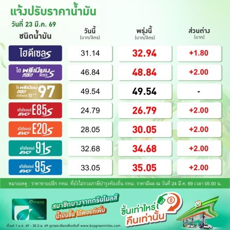 โดยราคาขายปลีกจะเป็น ราคาเบนซิน อยู่ที่ 43.64 บาทต่อลิตร, ราคาGSH95 อยู่ที่ 35.05 บาทต่อลิตร, E20 อยู่ที่ 30.05 บาทต่อลิตร, ราคาE85 อยู่ที่ 26.79 บาทต่อลิตร, ราคาGSH91 อยู่ที่ 34.68 บาทต่อลิตร, ราคาพรีเมี่ยม GSH95 อยู่ที่ 44.04 บาทต่อลิตร, ราคาHSD อยู่ที่ 32.94 บาท, พรีเมียมดีเซล อยู่ที่ 46.64 บาทต่อลิตร โดยราคาขายปลีกข้างต้นยังไม่