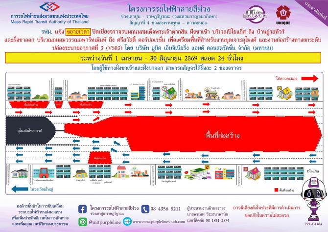 การรถไฟฟ้าขนส่งมวลชนแห่งประเทศไทย (รฟม.) แจ้งว่า บริษัท ยูนิค เอ็นจิเนียริ่ง แอนด์ คอนสตรัคชั่น จำกัด (มหาชน) ผู้รับจ้างงานออกแบบและก่อสร้างอุโมงค์ทางวิ่งและสถานีใต้ดิน โครงการรถไฟฟ้าสายสีม่วง ช่วงเตาปูน - ราษฎร์บูรณะ (วงแหวนกาญจนาภิเษก) สัญญาที่ 4 ช่วงสะพานพุทธ - ดาวคะนอง มีความจำเป็นต้องขยายเวลาปิดเบี่ยงจราจรบนถนนสมเด็จพระเจ้าตากสิน ฝั่งขาเข้า บริเวณปิโยแก๊ส ถึง บ้านอู่รถทัวร์ และฝั่งขาออก บริเวณถนอมวรรณอพาร์ทเม้นท์ ถึง ศรีสวัสดิ์ คอร์ปอเรชั่น เพื่อเตรียมพื้นที่สำหรับงานขุดเจาะอุโมงค์ และงานก่อสร้างทางยกระดับ ปล่องระบายอากาศที่ 3 (VS03) ระหว่างวันที่ 1 เมษายน - 30 มิถุนายน 2569 ตลอด 24 ชั่วโมง โดยผู้ใช้ทางฝั่งขาเข้าและฝั่งขาออก สามารถสัญจรได้ฝั่งละ 2 ช่องจราจร