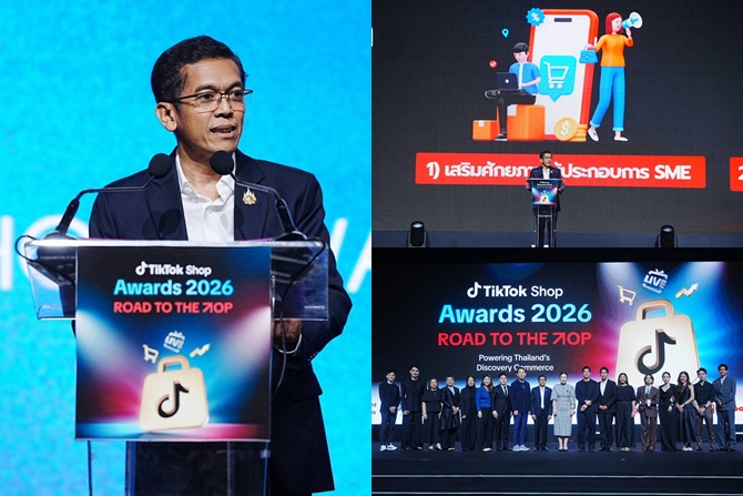 เมื่อวันที่ 24 มีนาคม 2569 นายสถาพร ร่วมนาพะยา รองอธิบดีกรมพัฒนาธุรกิจการค้า กระทรวงพาณิชย์ เปิดเผยว่า ในวันนี้ (24 มีนาคม 2569) ได้เข้าร่วมพิธีเปิดงาน TikTok Shop Awards 2026 ณ Union Hall 2 ศูนย์การค้ายูเนียน มอลล์ กรุงเทพมหานคร ซึ่งเป็นเวทีสำคัญที่รวบรวมผู้มีส่วนเกี่ยวข้องในระบบนิเวศของดิจิทัลคอมเมิร์ซ ทั้งผู้ขาย แบรนด์ ครีเอเตอร์ และพันธมิตรในอุตสาหกรรมเพื่อเฉลิมฉลองความสำเร็จของผู้ประกอบการไทยที่สามารถเติบโตบนแพลตฟอร์มดิจิทัล พร้อมแลกเปลี่ยนมุมมองเกี่ยวกับทิศทางของการค้าออนไลน์ในยุคที่คอนเทนต์เป็นศูนย์กลางของการขายสินค้า โดยภายในงานมีผู้เข้าร่วมงานกว่า 1,500 คน ประกอบด้วยร้านค้าแบรนด์ชั้นนำบน TikTok Shop ครีเอเตอร์ติดตะกร้าชื่อดังของประเทศ และพันธมิตรในอุตสาหกรรม พร้อมทั้งมีบูธแบรนด์ไทยกว่า 50 บูธ นำเสนอสินค้าและนวัตกรรมจากผู้ประกอบการที่ประสบความสำเร็จบนแพลตฟอร์ม