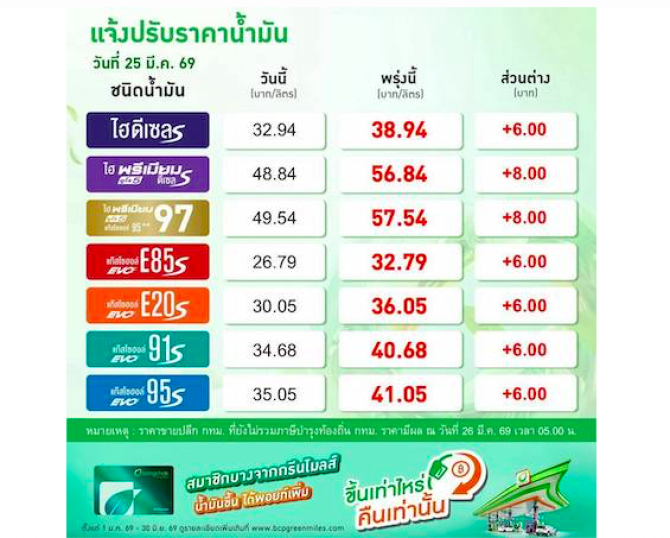 ผู้สื่อข่าวรายงานว่า PTT Station และบางจากฯ ปรับราคาขายปลีกน้ำมันULG95, GSH95, GSH91, E20, E85, HSD เพิ่มขึ้น 6.00 บาทต่อลิตร พรีเมี่ยม GSH95, พรีเมียมดีเซล เพิ่มขึ้น 8.00 บาทต่อลิตร ส่วน IK คงเดิม มีผลตั้งแต่เวลา 05.00 น. ในวันที่ 26 มี.ค. 2569 เป็นต้นไป