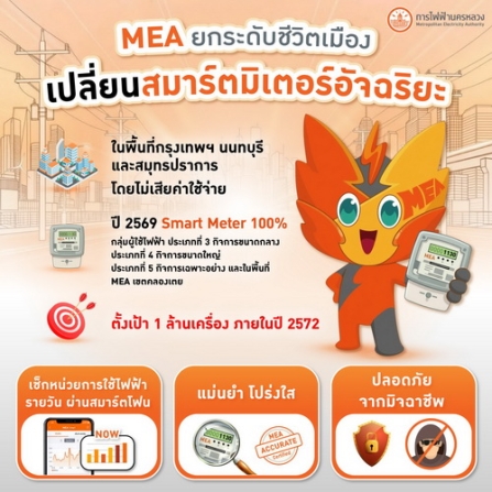 การไฟฟ้านครหลวง หรือ MEA เดินหน้ายกระดับระบบไฟฟ้าสู่เมื องอัจฉริยะในโครงการ Smart Metro Grid ด้วยการเปลี่ยนมิเตอร์ไฟฟ้ าแบบจานหมุนเดิม ให้เป็น "สมาร์ตมิเตอร์" (Smart Meter) รุ่นใหม่ล่าสุดที่ทันสมัยและมี ความเที่ยงตรง เพื่อให้ผู้ใช้ไฟฟ้าทั้ งประเภทบ้านอยู่อาศัย (Residential) และธุรกิจอุตสาหกรรม (Commercial and Industrial) สามารถบริหารจัดการพลังงานได้ อย่างมีประสิทธิภาพผ่านระบบรั บส่งข้อมูลอัจฉริยะ ซึ่งช่วยยกระดับงานบริการให้มี ความสะดวก รวดเร็ว และมีความปลอดภัย