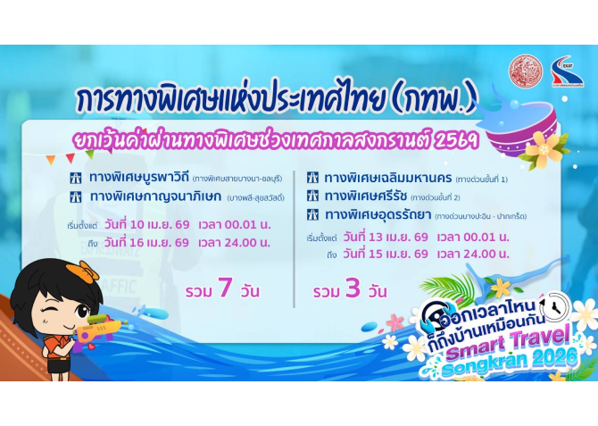 - ทางพิเศษบูรพาวิถี และ ทางพิเศษกาญจนาภิเษก (บางพลี – สุขสวัสดิ์) ยกเว้นค่าผ่านทางรวม 7 วัน ตั้งแต่วันที่ 10 เมษายน 2569 เวลา 00.01 น. ถึงวันที่ 16 เมษายน 2569 เวลา 24.00 น.