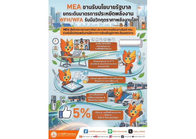การไฟฟ้านครหลวง หรือ MEA ในฐานะรัฐวิสาหกิจสังกัดกระทรวงมหาดไทย ประกาศความพร้อมขานรับนโยบายรัฐบาลและมติคณะรัฐมนตรี เพื่อร่วมรับมือกับสถานการณ์ความขัดแย้งในภูมิภาคตะวันออกกลางที่ส่งผลกระทบต่อโครงสร้างพื้นฐานและแหล่งผลิตน้ำมันดิบ ซึ่งนำไปสู่ความเสี่ยงด้านวิกฤตพลังงานและความผันผวนของราคาพลังงานทั่วโลก โดย MEA พร้อมทำหน้าที่เป็นหน่วยงานภาครัฐต้นแบบในการดำเนินมาตรการประหยัดพลังงานอย่างเข้มงวด ทั้งการส่งเสริมให้บุคลากรทำงานจากบ้าน (Work From Home) หรือทำงานจากทุกที่ที่มีความสะดวก (Work From Anywhere) เพื่อลดการใช้พลังงานในภาคขนส่งและลดการใช้ไฟฟ้าในอาคารสำนักงานอย่างเป็นรูปธรรมตามแนวทางของภาครัฐ