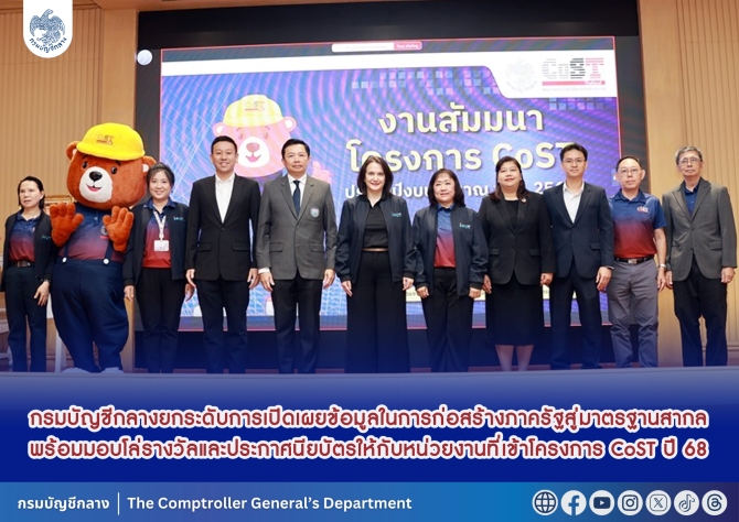 นางแพตริเซีย มงคลวนิช อธิบดีกรมบัญชีกลาง เปิดเผยว่า กรมบัญชีกลางได้จัดพิธีมอบโล่รางวัลและประกาศนียบัตรให้กับหน่วยงานที่เข้าร่วมโครงการความโปร่งใสในการก่อสร้างภาครัฐ (Infrastructure Transparency: CoST) ประจำปีงบประมาณ พ.ศ. 2568 เพื่อเป็นการยกย่อง เชิดชู และสร้างขวัญกำลังใจให้แก่หน่วยงานที่มีจำนวนโครงการก่อสร้าง ที่เข้าร่วมโครงการ CoST สูงสุด 3 ลำดับแรก ได้แก่ 1. องค์การบริหารส่วนจังหวัดชลบุรี 2. องค์การบริหารส่วนจังหวัดสุราษฎร์ธานี และ 3.กรุงเทพมหานคร และมอบประกาศนียบัตรให้กับหน่วยงานที่มีร้อยละการเปิดเผยข้อมูลในระดับดีเด่น ประจำปีงบประมาณ พ.ศ. 2568 ในส่วนกลาง รวมทั้งสิ้น 25 โครงการ ประกอบด้วย หน่วยงานภายใต้กรุงเทพมหานคร จำนวน 22 โครงการ (จาก 19 หน่วยงาน) สำนักงานมาตรฐานสินค้าเกษตรและอาหารแห่งชาติ (มกอช.) จำนวน 2 โครงการ และบริษัท ปตท. จำกัด (มหาชน) จำนวน 1 โครงการ ทั้งนี้ ภายในงานมีปาฐกถาพิเศษในหัวข้อ “การสร้างการมีส่วนร่วมของภาคประชาชนในการป้องกันการทุจริตโดยโครงการ CoST” โดย อธิบดีกรมบัญชีกลาง และปาฐกถาพิเศษในหัวข้อ