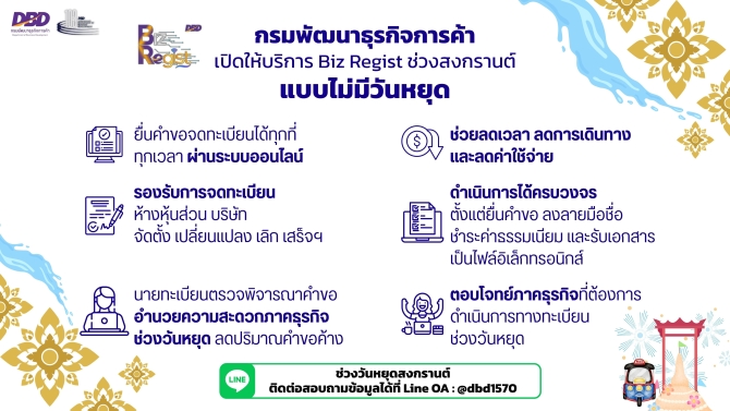 ทั้งนี้ กรมพัฒนาธุรกิจการค้าขอเชิญชวนผู้ประกอบธุรกิจที่มีความประสงค์จะดำเนินการด้านทะเบียนนิติบุคคล ใช้บริการผ่านระบบ DBD Biz Regist ได้ตลอดช่วงเทศกาลสงกรานต์ เพื่อความสะดวก รวดเร็ว และต่อเนื่องในการดำเนินธุรกิจ โดยสามารถศึกษารายละเอียดและติดต่อสอบถามเพิ่มเติมได้ผ่านช่องทางต่างๆ ของกรม ได้แก่ เว็บไซต์กรมพัฒนาธุรกิจการค้า www.dbd.go.th รวมทั้ง Line Official Account DBD.Registration : @dbd1570” อธิบดีพูนพงษ์ฯ กล่าวทิ้งท้าย
