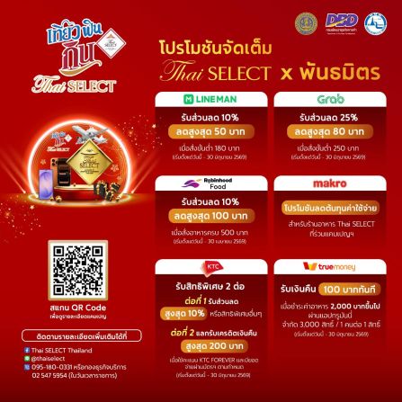 กระจายโอกาสสู่ท้องถิ่น และยกระดับภาพลักษณ์อาหารไทยในฐานะ Soft Power สำคัญของประเทศ จัดสิทธิพิเศษสำหรับผู้บริโภคทั้งส่วนลดผ่านแพลตฟอร์มฟู้ดเดลิเวอรีชั้นนำ ได้แก่ Grab, LINE MAN และ Robinhood รวมถึงสิทธิพิเศษด้านการชำระเงินผ่านบัตรเครดิต KTC และ TrueMoney Wallet เพื่อเชิญชวนให้นักชิมได้ลิ้มลองอาหารไทยจากร้านอาหาร Thai SELECT ทั่วประเทศ