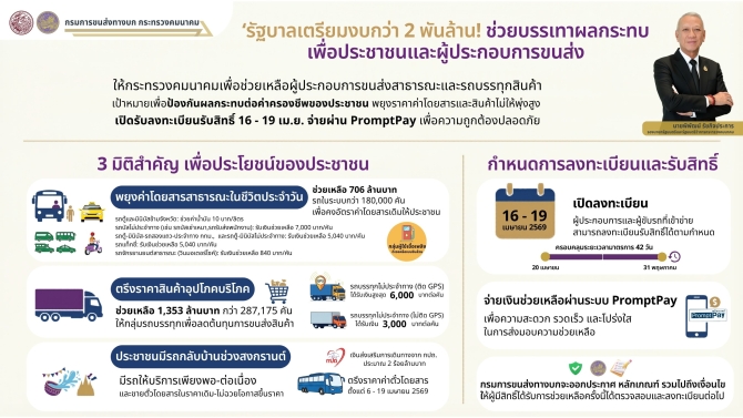 สำหรับกลุ่มผู้ประกอบการขนส่งและผู้ขับรถที่เข้าข่ายได้รับการช่วยเหลือ กรมการขนส่งทางบกจะเปิดให้ ลงทะเบียนรับสิทธิ์ระหว่างวันที่ 16 - 19 เมษายน 2569 โดยจะจ่ายเงินช่วยเหลือผ่านระบบ PromptPay เพื่อช่วยเหลือผู้ประกอบการขนส่งในการเดินรถตลอดระยะเวลา 42 วัน (20 เม.ย. - 31 พ.ค. 69) โดยทางกรมการขนส่งทางบกจะออกประกาศ หลักเกณฑ์ รวมไปถึงเงื่อนไขให้ผู้มีสิทธิ์ได้รับการช่วยเหลือครั้งนี้ได้ตรวจสอบและลงทะเบียนต่อไป ทั้งนี้ มาตรการทั้งหมดเป็นการแสดงให้เห็นถึงความมุ่งมั่นของรัฐบาลและกระทรวงคมนาคม ในการดูแลรักษาสมดุลทั้งระบบเศรษฐกิจ สภาพคล่องของผู้ประกอบการ และคุณภาพชีวิตของพี่น้องประชาชนให้ก้าวผ่านวิกฤตพลังงานครั้งนี้ไปด้วยกัน