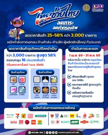 อธิบดีพูนพงษ์ฯ กล่าวต่อว่า “กระทรวงพาณิชย์ ได้เปิดตัวสินค้า ‘ไทยช่วยไทย’ ลดภาระ ลดค่าครองชีพ เมื่อวันที่ 1 เมษายน 2569 ที่ผ่านมา โดยได้รับความร่วมมือจากห้างค้าส่ง-ค้าปลีกรายใหญ่ อาทิ แม็คโคร โลตัส บิ๊กซี เดอะมอลล์ Tops วัตสัน ฟู้ดแลนด์ 7-11 ซีเจ มอร์ และผู้ผลิตสินค้าอุปโภคบริโภคทั่วประเทศ อาทิ สหพัฒน์ ยูนิลิเวอร์ BJC Kao ไวไว ข้าวมาบุญครอง ข้าวแสนดี ข้าวหงษ์ทอง และข้าวไก่แจ้ นำสินค้าอุปโภคบริโภคที่จำเป็นมาจำหน่ายในราคาพิเศษกว่า 3,000 รายการ ครอบคลุม 16 ประเภทสินค้า ลดราคาตั้งแต่ 25-58% อาทิ สินค้าเฮ้าส์แบรนด์ จาก Tops เช่น * ท็อปส์ข้าวหอม 100 เปอร์เซ็นต์ 5กก. ราคาโปรโมชัน 112 บาท ถูกกว่าแบรนด์หลัก 10 - 20 บาท *มัสท์ชูกระดาษชำระแบบม้วนเอ็กซ์ตร้า 24 ม้วน ราคาโปรโมชัน 95 บาท ถูกกว่าแบรนด์หลัก 20 - 50 บาท *ถูกใจผงซักฟอกสูตรมาตรฐานสำหรับซักเครื่อง 1,000 กรัม ราคาโปรโมชัน 35 บาท ถูกกว่าแบรนด์หลัก 20 35 บาท *สมาร์ทเตอร์น้ำยาล้างจานกลิ่นมะนาว 740 มล. แพค 3 ราคาโปรโมชัน 99 บาท ถูกกว่าแบรนด์หลัก 20 - 40 บาท เป็นต้น และ Tops ยังมีสินค้าเฮ้าส์แบรนด์ กว่า 600 รายการ ที่นำมาร่วมลดราคา รวมถึง เฮ้าส์แบรนด์จากแม็คโคร โลตัส บิ๊กซี เดอะมอลล์ วัตสัน ที่นำมาร่วมลดราคาอีกหลายพันรายการ ซึ่งสินค้า ‘ไทยช่วยไทย’ ลดภาระ ลดค่าครองชีพ จะดำเนินการในระยะแรกตั้งแต่วันที่ 1 เมษายน 2569 ซึ่งครอบคลุมช่วงเทศกาลสงกรานต์พอดี ประชาชนสามารถจับจ่ายสินค้าได้ในราคาประหยัดอย่างทั่วถึง ช่วยบรรเทาภาระค่าใช้จ่ายในช่วงที่มีความต้องการใช้จ่ายสูง”
