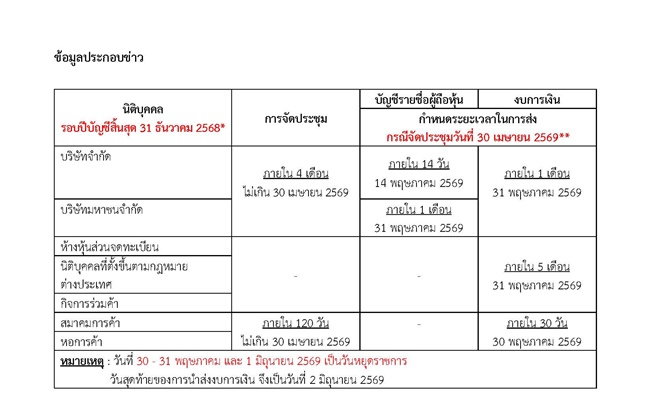 นิติบุคคลที่ต้องนำส่งงบการเงินในปีนี้ กรณีที่เป็นบริษัทจำกัด และบริษัทมหาชนจำกัดที่ใช้รอบปีบัญชีสิ้นสุดวันที่ 31 ธันวาคม 2568 ต้องจัดให้มีการประชุมผู้ถือหุ้นเพื่ออนุมัติงบการเงินภายใน 4 เดือนหลังจากสิ้นรอบปีบัญชี หรือภายในวันที่ 30 เมษายน 2569 และต้องนำส่งงบการเงินภายใน 4 เดือน แต่ปีนี้ 31 พฤษภาคม ซึ่งเป็นวันสุดท้ายเป็นวันหยุดทำให้สามารถส่งได้อย่างช้าที่สุดคือวันที่ 2 มิถุนายน 2569 รวมถึง ห้างหุ้นส่วนจดทะเบียน กิจการร่วมค้า และนิติบุคคลต่างประเทศที่ปิดรอบปีบัญชีสิ้นสุดวันที่ 31 ธันวาคม 2568 จะต้องนำส่งงบการเงินภายใน 5 เดือน หลังจากวันปิดรอบปีบัญชี โดยปีนี้สามารถนำส่งงบการเงินได้ถึงวันที่ 2 มิถุนายน 2569 เช่นเดียวกัน รวมทั้ง สมาคมการค้า หอการค้าที่ปิดรอบปีบัญชีสิ้นสุดวันที่ 31 ธันวาคม 2568 ฉะนั้นหากจัดประชุมใหญ่อนุมัติงบการเงินในวันที่ 30 เมษายน 2569 จะต้องส่งงบการเงินภายในวันที่ 2 มิถุนายน 2569
