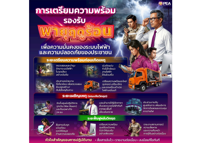 การไฟฟ้าส่วนภูมิภาค (PEA) เดินหน้าเตรียมความพร้อมรองรับสถานการณ์พายุฤดูร้อนที่อาจเกิดขึ้นในหลายพื้นที่ทั่วประเทศ โดยมุ่งเน้นการเสริมความมั่นคงของระบบไฟฟ้า ควบคู่กับการดูแลความปลอดภัยในชีวิตและทรัพย์สินของประชาชนอย่างรอบด้าน