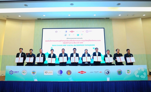 กระทรวงการอุดมศึกษา วิทยาศาสตร์ วิจัยและนวัตกรรม โดยสถาบันวิจัยวิทยาศาสตร์และเทคโนโลยีแห่งประเทศไทย (วว.) และหน่วยบริหารจัดการทุนด้านการเพิ่มความสามารถการแข่งขัน (บพข.) ร่วมกับ กลุ่มบริษัท ดาว ประเทศไทย (Dow) อำเภอบ้านฉาง สำนักงานนิคมอุตสาหกรรมดับบลิวเอชเอตะวันออก (มาบตาพุด) และเทศบาลในพื้นที่ ลงนามบันทึกข้อตกลงความร่วมมือ (MOU) เพื่อขยายผลและยกระดับการดำเนินงานศูนย์นวัตกรรมเศรษฐกิจหมุนเวียนเพื่อจัดการและแปรรูปวัสดุรีไซเคิลครบวงจร (Ban Chang MRF) ณ ห้องประชุมทาวน์ฮอลล์ กลุ่มบริษัท ดาว ประเทศไทย ในนิคมอุตสาหกรรมเอเซีย อำเภอบ้านฉาง จังหวัดระยอง นับเป็นความร่วมมือครั้งสำคัญของภาครัฐ ภาคเอกชน ภาควิจัย และภาคท้องถิ่น