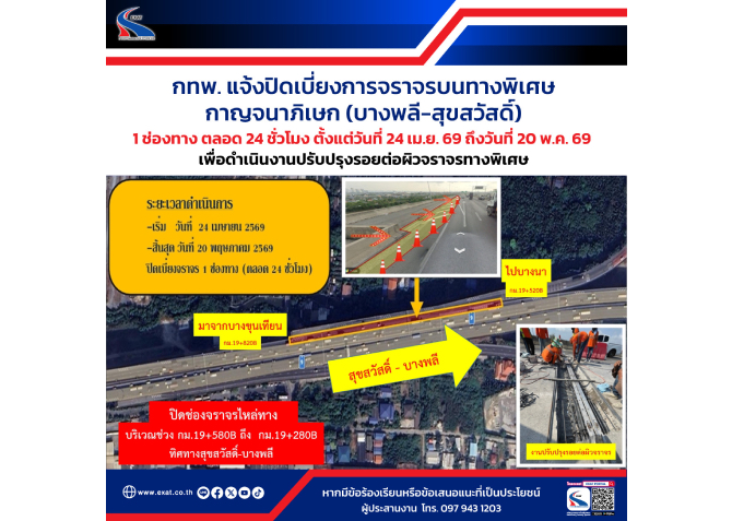 การทางพิเศษแห่งประเทศไทย (กทพ.) ได้ว่าจ้าง กิจการร่วมค้า DW เพื่อดำเนินงานปรับปรุงรอยต่อผิวจราจรทางพิเศษกาญจนาภิเษก (บางพลี-สุขสวัสดิ์) ช่วง กม.19+520 ถึง กม.19+820 ทิศทางบางพลี-สุขสวัสดิ์ และช่วง กม.19+580 ถึง กม.19+280 ทิศทางสุขสวัสดิ์-บางพลี โดยผู้รับจ้างจะเข้าดำเนินงานปรับปรุงรอยต่อผิวจราจรดังกล่าว จึงมีความจำเป็นต้องปิดเบี่ยงการจราจรบนทางพิเศษกาญจนาภิเษก (บางพลี-สุขสวัสดิ์) บริเวณ กม.19+580 B ถึง กม.19+280 B ทิศทางสุขสวัสดิ์-บางพลี 1 ช่องทาง ตลอด 24 ชั่วโมง ตั้งแต่วันที่ 24 เมษายน 2569 ถึงวันที่ 20 พฤษภาคม 2569