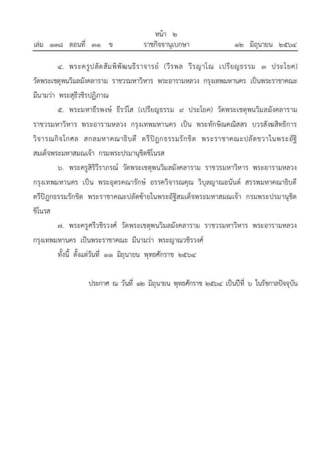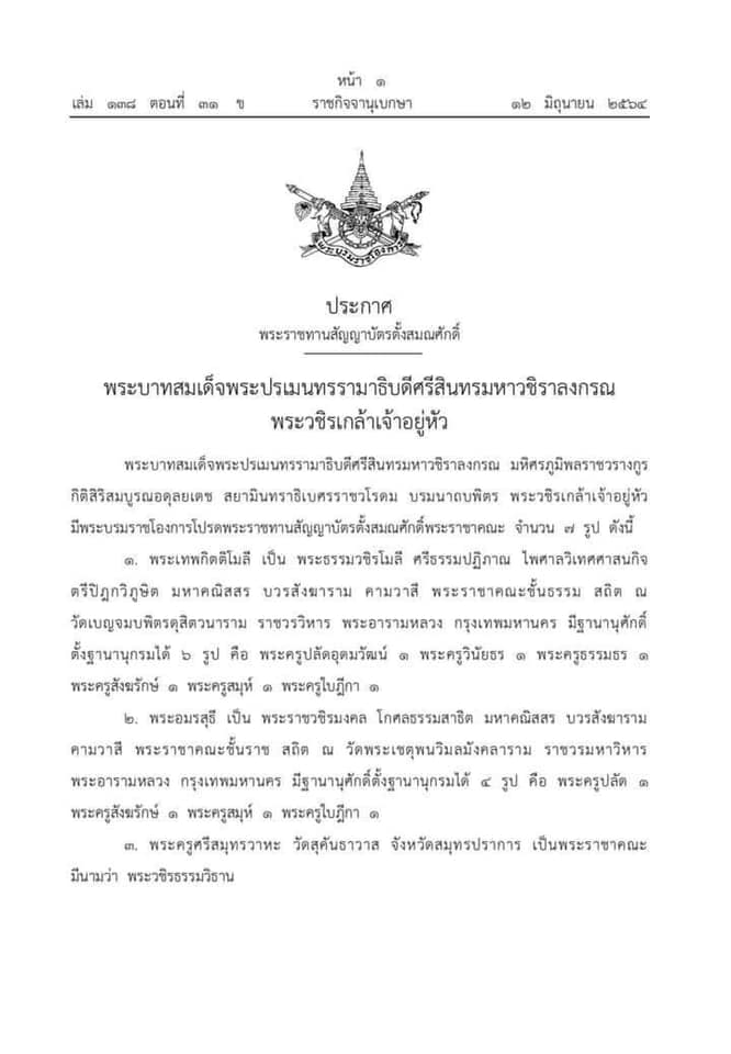 วันที่ 12 มิถุนายน พ.ศ.2564 ผู้สื่อข่าวรายงานว่า เว็บไซต์ราชกิจจานุเบกษาได้เผยแพร่ประกาศพระราชทานสัญญาบัตรตั้งสมณศักดิ์ ความว่า