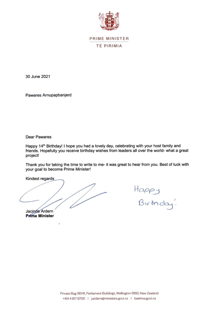 เรื่องราวดีๆของนักเรียนไทยในนิวซีแลนด์ “น้องภูฟ้า-ปวเรศ อานุภาพบรรเจิด” ปลื้มใจสุด ๆ ที่ได้รับจดหมายอวยพรวันเกิดจาก จาซินดา อาร์เดิร์น นายกฯ หญิงคนเก่งของนิวซีแลนด์ ขณะติดอยู่นิวซีแลนด์เพราะสถานการณ์โควิด-19 และไม่ได้บินกลับมาฉลองวันเกิดกับครอบครัว ถึงแม้ว่าอยู่ที่นิวซีแลนด์จะสนุก มีกิจกรรมให้ทำมากมาย แต่ก็แอบเหงาและคิดถึงบ้านบ้าง โดยเฉพาะในช่วงวันเกิดที่ผ่านมา เลยคิดว่าจะทำอะไรให้กับตัวเองดี น้องภูฟ้าจึงเขียนอีเมล์หานายกฯนิวซีแลนด์ และมีความฝันว่าในปีนี้ที่อายุครบ 14 ปี อยากจะได้รับคำอวยพรจากผู้นำประเทศ และก็เป็นจริงอีเมล์น้องภูฟ้าไม่รอดสายตา จาซินดา อาร์เดิร์น สมแล้วที่เธอเป็นแบบอย่างของผู้นำหญิงที่โลกชื่นชม ถือเป็นฝันเล็ก ๆของเด็กไทยในต่างแดน