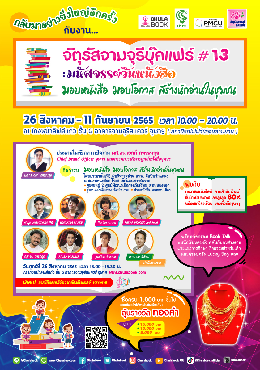 พบกับงาน จัตุรัสจามจุรีบุ๊คแฟร์ ครั้งที่ 13 : มหัศจรรย์วันหนังสือ จัดขึ้นระหว่างวันที่ 26 สิงหาคม ถึง 11 กันยายน 2565 เวลา 10.00 – 20.00 น. ณ โถงชั้น G อาคารจามจุรีสแควร์ จุฬาลงกรณ์มหาวิทยาลัย (สถานีรถไฟฟ้าใต้ดินสามย่าน)