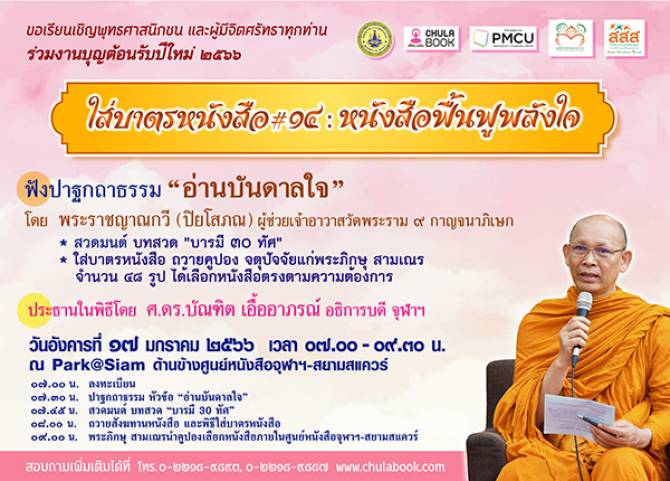 ในวาระขึ้นปีใหม่ 2566 ศูนย์หนังสือจุฬาลงกรณ์มหาวิทยาลัย ร่วมกับ วัดพระราม ๙ กาญจนาภิเษก นักงานจัดการทรัพย์สินจุฬาลงกรณ์มหาวิทยาลัย และแผนงานสร้างเสริมวัฒนธรรมการอ่าน (สสส) ขอเชิญร่วมกิจกรรม “ใส่บาตรหนังสือ ครั้งที่ 14 : หนังสือฟื้นฟูพลังใจ” โดยเปิดโอกาสให้ประชาชนชาวไทยได้ร่วมกันทำบุญใส่บาตรหนังสือให้กับพระสงฆ์และสามเณร จำนวน 48 รูป ซึ่งกำลังศึกษาอยู่ในโรงเรียนพระปริยัติธรรม พร้อมฟังปาฐกถาธรรมหัวข้อ “อ่านบันดาลใจ” โดย พระราชญาณกวี (ปิยโสภณ) ผู้ช่วยเจ้าอาวาส วัดพระราม ๙ กาญจนาภิเษก และร่วมกันสวดมนต์ บทสวด “บารมี 30 ทัศ” เพื่อความเป็นสิริมงคล ในวันอังคารที่ 17 มกราคม 2566 เวลา 06.00 – 09.00 น. ณ Park @ Siam ด้านข้าง ศูนย์หนังสือจุฬาฯ สยามสแควร์ ผู้สนใจสอบถามเพิ่มเติมได้ที่ โทร.0-2218-9893
