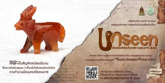 นิทรรศการ "Unseen เปิดคลังพิพิธภัณฑสถานแห่งชาติ ชุมพร" ให้ความรู้เรื่องการก่อตั้งพิพิธภัณฑ์ พร้อมนำโบราณวัตถุภายในคลังพิพิธภัณฑสถานแห่งชาติ ชุมพร ที่มีคุณค่าทางประวัติศาสตร์ ซึ่งไม่เคยนำออกมาจัดแสดงเผยแพร่ต่อสาธารณะมาก่อน มาจัดแสดงให้ผู้สนใจได้เข้าชม โดยมีโบราณวัตถุที่พบจากแหล่งโบราณคดีที่สำคัญของจังหวัดชุมพร เช่น ลูกปัดและเครื่องประดับ (ลูกปัดรูปหงส์ ลูกปัดรูปแพะภูเขา ลูกปัดแก้วอำพันทอง) จากแหล่งโบราณคดีเขาเสก อำเภอหลังสวน จังหวัดชุมพร กลองมโหระทึก จากแหล่งโบราณคดีเขาสามแก้ว อำเภอเมือง จังหวัดชุมพร ภาชนะดินเผาสามขา จากแหล่งโบราณคดีเขาทะลุ อำเภอสวี จังหวัดชุมพร