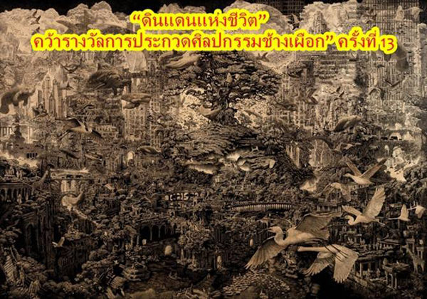 คุณธีรพล โพธิ์เปี้ยศรี ผู้ชนะรางวัลช้างเผือก ในผลงานชื่อ “ดินแดนแห่งชีวิต” เผยว่า “ความหลากหลายทางชีวภาพ ผมนึกถึงสิ่งแวดล้อม ผมมองว่าเป็นการเชื่อมโยงระหว่าง ธรรมชาติกับสิ่งมีชีวิตซึ่งเป็นการพึ่งพาอาศัยเกื้อกูลกัน พื้นเพผมเป็นคนต่างจังหวัดอยู่กับท้องทุ่งได้ใช้ชีวิตกับพื้นที่ระบบนิเวศที่สมบูรณ์เป็นวิถีชีวิตแบบหากิน ในงานภาพพิมพ์ของผมจะเห็นได้ว่ามีสัตว์ สิ่งแวดล้อม ที่พักอาศัยของมนุษย์เป็นการปรับตัวของสิ่งมีชีวิตกับธรรมชาติให้มีความสมดุลกัน จัดองค์ประกอบงานชิ้นนี้คือการนำเอารูปแบบของสิ่งแวดล้อม สัตว์ ที่อยู่อาศัยของผู้คนให้มีเสปซที่กว้างเพื่อให้เห็นถึงการอยู่อาศัย การเรียนรู้ การอนุรักษ์ การรักษาไว้ซึ่งระบบนิเวศ ผมอยากให้ผลงานศิลปะได้เป็นเครื่องมือสื่อสารให้กับผู้คนทั่วไปได้เล็งเห็นและตระหนักถึงการมีอยู่ของสิ่งมีชีวิต คุณค่าของธรรมชาติ การอาศัยซึ่งกันและกัน และเกื้อกูลกันอยู่เสมอ”
