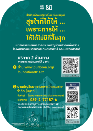 2. ผ่านบัญชี ธนาคารทหารไทยธนชาต จำกัด (มหาชน) เลขที่บัญชี 069-2-77187-6 ชื่อบัญชีโรงพยาบาลมหาวิทยาลัยเกษตรศาสตร์ ติดตามเพจคณะแพทยศาสตร์ มหาวิทยาลัยเกษตรศาสตร์ ก้าวสำคัญในการรับใช้สังคมและประเทศชาติของมหาวิทยาลัยเกษตรศาสตร์ในทศวรรษที่ 9 ได้ที่ https://www.facebook.com/profile.php?id=100086218923974