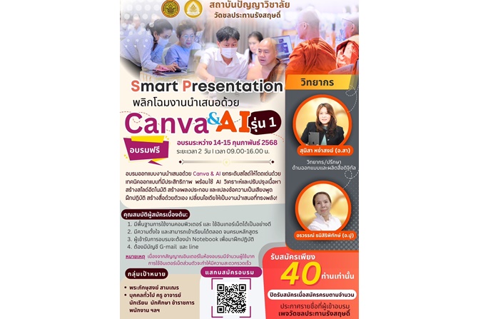 สถาบันปัญญาวิชชาลัย วัดชลประทานรังสฤษดิ์ พระอารามหลวง จ.นนทบุรีเปิดอบรมหลักสูตร "Smart Presentation พลิกโฉมงานนำเสนอด้วย Canva & AI รุ่นที่ 1" ฟรี ขอให้ผู้ที่สมัครเข้ามาอบรมมีความตั้งใจรับความรู้ เพื่อให้ตนสามารถนำไปใช้ ในการพัฒนางานเผยแผ่พระพุทธศาสนา , การทำงานในส่วนต่างๆที่ต้องการประชาสัมพันธ์ข้อมูล , การเรียนการสอน หรือนำความรู้ที่ได้รับงอกเงยเป็นประโยชน์ต่อตนเอง