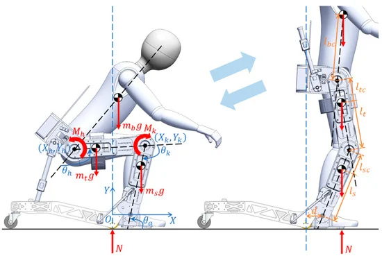 โครงร่างการออกแบบหุ่นยนต์ Wheelchair Exoskeleton - “เราใช้หลักการ Kinematics Compatibility หรือความเข้ากันได้เชิงจลศาสตร์ในการออกแบบหุ่นสวมใส่บนร่างกาย กระดูกคนเป็นกระดูกถ้วยกับกระดูกก้อนที่มาสไลด์กัน แต่กลไกมอเตอร์ หมุนรอบแกนหมุนแกนเดียว เมื่อเอามอเตอร์มาติด จะไม่สอดคล้องกับสรีระคนโดยตรง เราจึงออกแบบข้อต่อหัวเข่าให้เป็น Linkage เพื่อให้เส้นทางการเคลื่อนที่ของจุดศูนย์กลางการหมุน สามารถเลียนแบบกระดูกจริง ข้อต่อที่มีการงอขาเยอะ ๆ ก็ใช้ Four-bar Linkage เพื่อให้จุดหมุนเปลี่ยนไปตามข้อต่อได้”