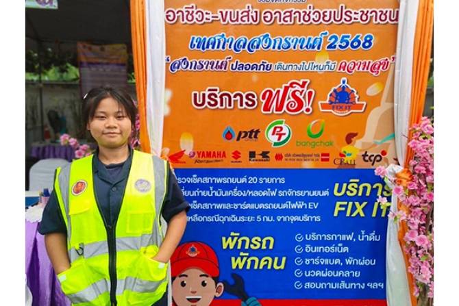 นศ.หญิง หนึ่งเดียวในทีมช่างยนต์ ว.เทคนิคนนทบุรี ร่วมให้บริการดูประชาชนช่วงสงกรานต์
