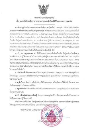 1. ข้าราชการครูและบุคลากรที่ได้รับผลกระทบจากน้ำท่วมบ้านพัก ที่อยู่อาศัย หรือเส้นทาง การเดินทางมาปฏิบัติราชการ ให้รายงานข้อมูลต่อผู้อำนวยการสถานศึกษาในไลน์ราชการทุกวัน ไม่ต้องเดินทางมาลงเวลาปฏิบัติราชการที่โรงเรียน โดยอนุญาตให้ทำงานที่บ้าน (Work From Home : WFH) ใช้เทคโนโลยีเป็นเครื่องมือในการติดต่อสื่อสารกับสถานศึกษา เพื่อนร่วมงาน และการจัดการเรียนการสอน ผ่านช่องทางออนไลน์หรือช่องทางอื่นตามความเหมาะสม ไม่ถือเป็นวันลา หากสถานการณ์คลี่คลายให้มาปฏิบัติราชการตามปกติ